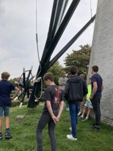 Na de lunch reisden we door naar Biervliet, waar de molen op 11 september j.l. feestelijk was heropend na een grondige restauratie. Aangekomen was het zowaar droog, en Sjaak Lijbaart opende samen met zijn zoon de molen voor ons. In de belt kregen we uitleg over de geschiedenis: de molen was ooit een stellingmolen en heeft ook dienst gedaan als oliemolen.Marion Lippens van het bestuur sloot aan en vertelde ons meer over de restauratie en de wensen die er nog liggen voor verdere aanpak. Daarna mochten we zelf aan de slag: zeilen voorleggen , nog eens verkruien, en in groepjes de kap in, waar we uitgebreide uitleg kregen. Marion trakteerde de groep tenslotte op frisdrank en een snoepje – een welkome pauze.